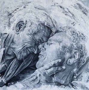 2022Schilderij van een echtpaar gemaakt op canvas. De stijl is Mix Media (print en acryl/medium). formaat: 60x60cm. Richtprijs: 150 euro